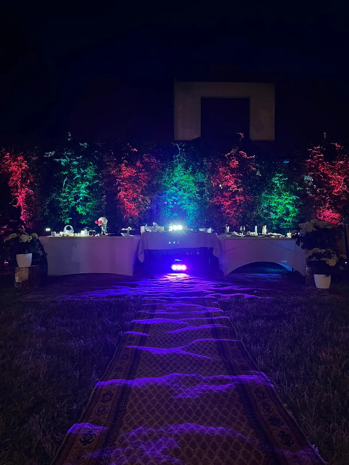 Do oświetlenia ogrodu na wesele wykorzystaliśmy lampy bateryjne, co pozwoliło nam uniknąć kłopotliwych kabli i zachować estetykę przestrzeni. Zastosowaliśmy cztery typy oświetlenia: punktowe lampy EasyHex, oświetlenie architektoniczne EasyBook, lampy EasyPar do mocniejszych akcentów w rogach namiotu i ogrodu oraz panele EasyBar S w trybie jednostajnym (bufet i podswietlenie mebli) oraz reagującym na dźwięk (migające światła na parkiet). Dzięki różnorodnym rozwiązaniom świetlnym, każde miejsce w ogrodzie nabrało magicznego klimatu, idealnego do integracji gości i zabawy.
