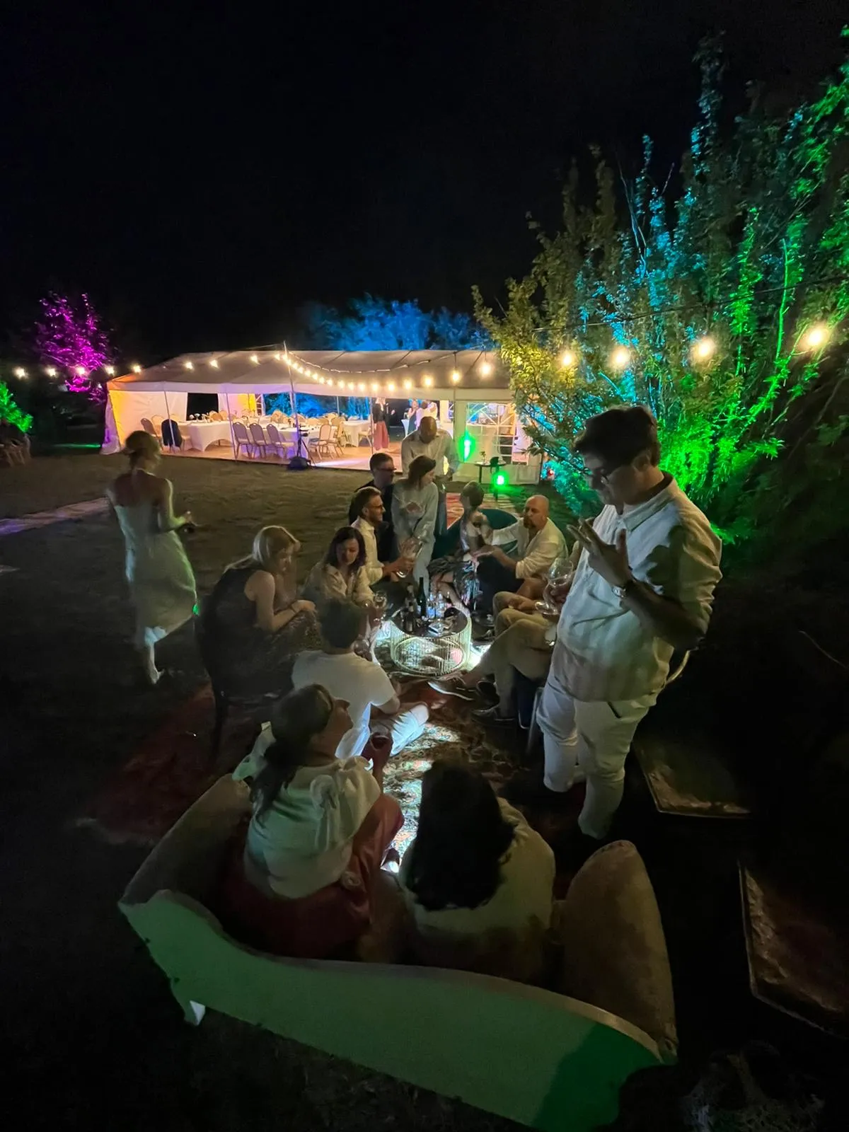 Wesele odbyło się pod namiotem eventowym, który został zaaranżowany pod stoły bankietowe oraz parkiet do tańca. Całe wydarzenie utrzymane było w stylu boho, z tureckimi dywanami położonymi bezpośrednio na trawie, starymi, tapicerowanymi sofami i fotelami nie do pary, meblami z epoki wymieszanymi z nowoczesnymi stolikami ze szkła i metalu. Naszym zadaniem było stworzenie nastrojowego i funkcjonalnego oświetlenia, które podkreśli wyjątkowy charakter imprezy.